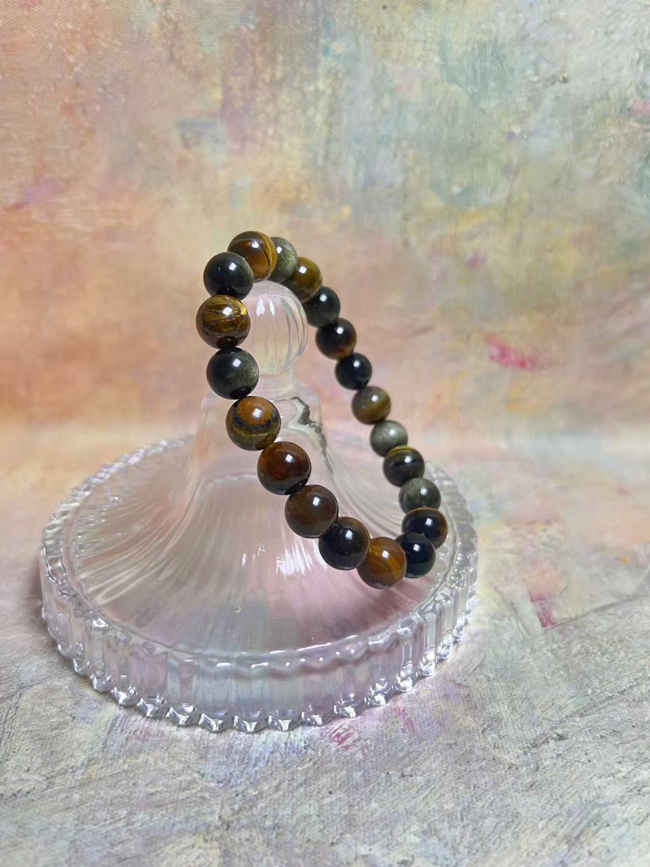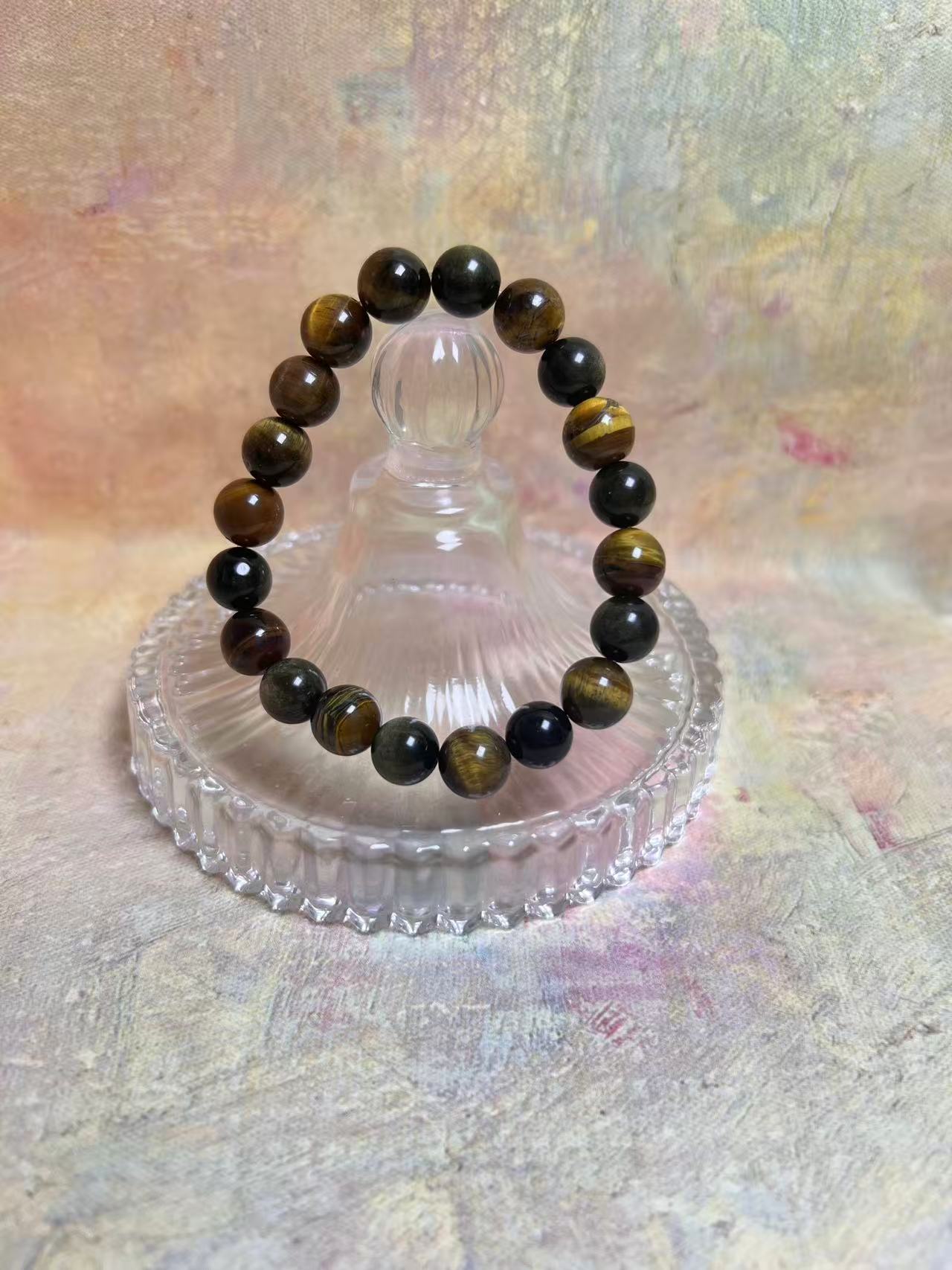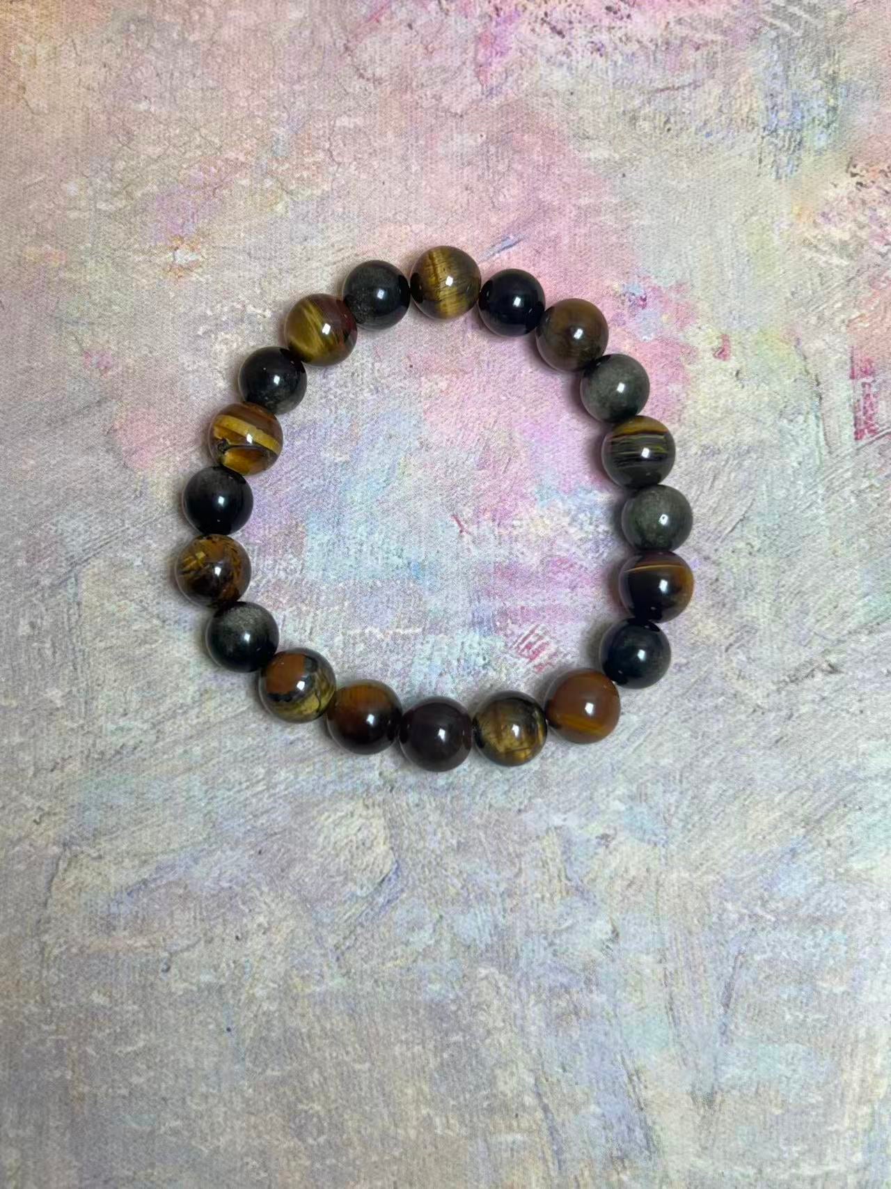 This bracelet weaves together the warm golden-brown hues of Tiger’s Eye with the deep, shimmering tones of Gold Obsidian, like sunlight piercing through the night, creating a unique rhythm between light and shadow. Tiger’s Eye brings inner calm and protection, steady as a mountain, while Gold Obsidian sparkles with delicate golden flecks, like stars scattered across the night sky, awakening focus and strength.